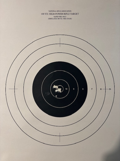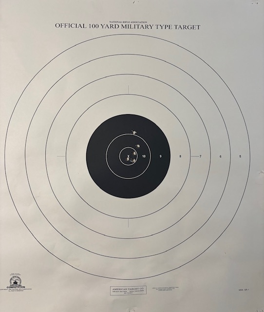 Got there just at opening, 0900, wanted to get this done quick before the temps ran up into the 90’s. Weather was clear with light and variable winds. I had previously zeroed the rifle and scope at 100 yards. The trajectory of my match load follows Mk 7 ball ammo very closely, so that the 300 and 600 yd scope elevation settings get the center of the group very close (within 1/2 MOA) of the center of the target. I fired two 300 yard 10 shot groups and two 600 yd 10 shot groups and I’m quite pleased with the results. My 600 yard scores were 95 and 98. A significant improvement over the CBI barrel that has been averaging around 90. Muzzle velocity is ticking up slightly, now the mean velocity is at 2375 fps for the 40.3 gr Varget load with 174 SMKs. As luck would have it, my first shot at 600 yds was a center X. Had to stop and take a picture: ![]() The first shot on the second 600 yd group was a low 8, held the scope reticule a bit too low and that shot was the slowest velocity of the 10 shot group at 2350 fps. The next 9 shots were all good, just over 1.5 MOA group. ![]() So, I will send that Criterion barrel I installed in March back to CBI and see if they will send me a new one. It just won’t group well. I’m quite pleased with the Walther barrel, shame we can’t get them in the US anymore. |