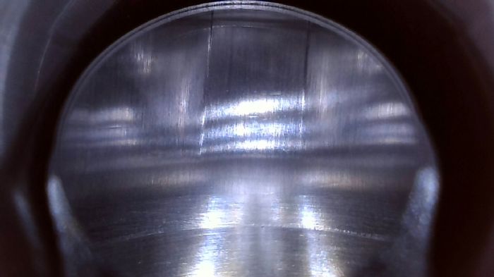 ![]() This is a RH twist barrel, so there would be no tendency for bullet torque trying to unscrew the barrel, I didn’t see a reason that 100+ foot lbs of torque was necessary to shoot accurately and keep the barrel from loosening. A .3040- diameter pin gage enters the muzzle, 0.3045- does not. A bit larger than I expected. 4 groove barrel, looks like the lands are a bit narrower than the grooves. Grooves are supposedly 0.314 but I’ve not slugged the bore yet. LW did a very good job on the throat, barely any visible reaming marks. Throat length is good too, a 174 gr SMK seated to 3.07” OAL jumps 0.06” to reach the lands. A 174 gr Hornady .312 BTHP Match bullet contacts the lands at 3.072”, so these bullets probably need to be seated to 3.05” OAL. Borescope photo showing origin of the rifling. ![]() |