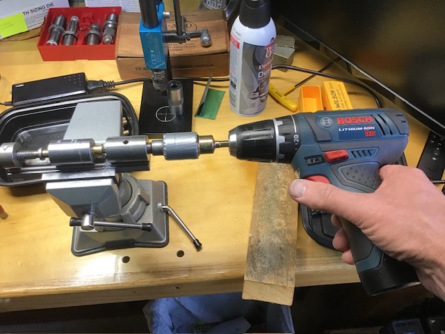 Got tired of turning the primer pocket reamer by hand. Amazing what you can do with duct tape.