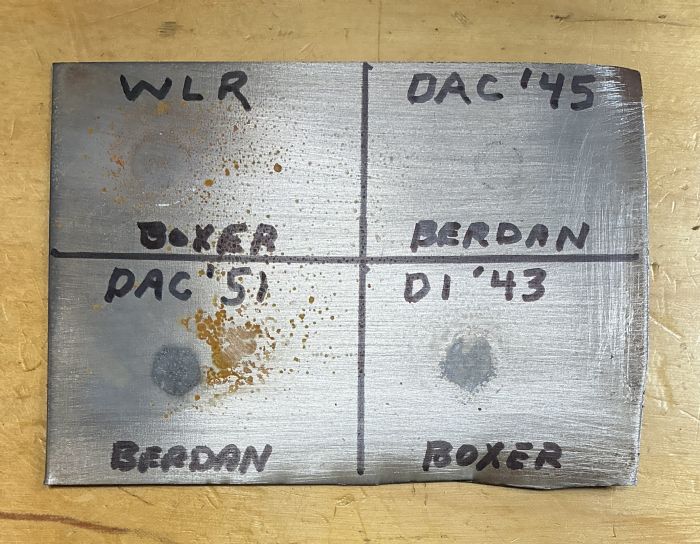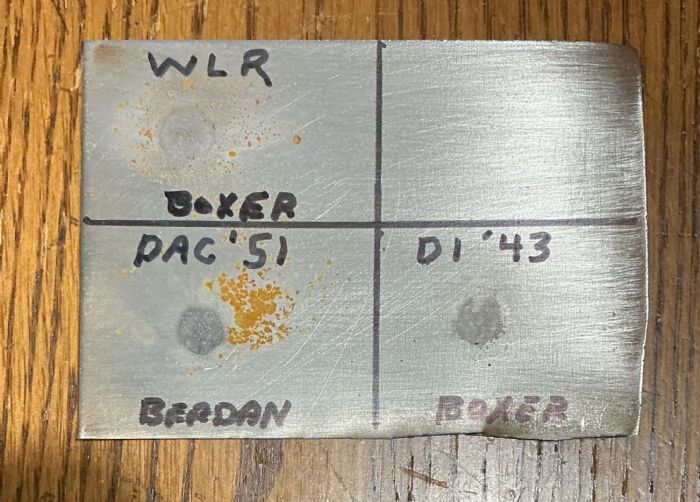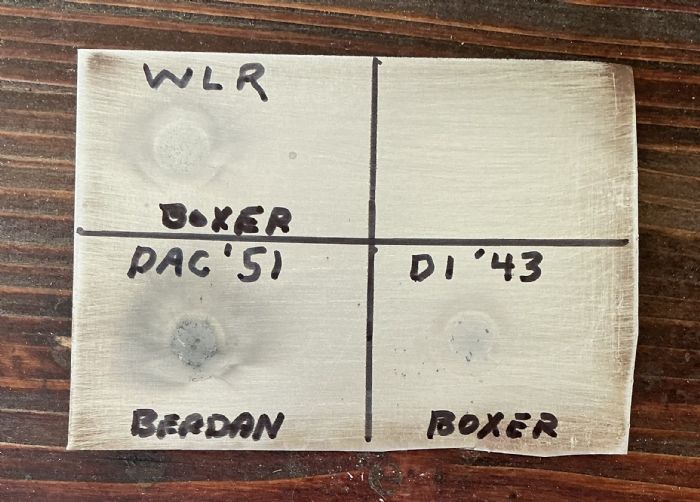 I pulled down the two WRA ‘49 and ‘45 DAC rounds, snapped the primers with the muzzle resting on the steel test sheet. The DAC Berdan primer did not leave any primer residue, a few small specs. The WRA Boxer primer left a similar gray stain as the others I tested last week. Test sample is back in the humidor and will see what happens.