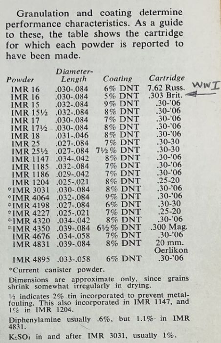 Both cartridges had smokeless stick granulation powder that appeared identical in dimensions of the sticks and the colour to 1960’s 3031 powder I have in my cabinet. The sticks measured 0.030” in diameter and 0.084” long, which corresponds to IMR 3031 per this 1960’s article in the NRA Illustrated Reloading Handbook (below). ![]() Per this Handbook, IMR 3031 dates back to 1934. It is a “canister” powder sold commercially so might be slightly different from the “bulk” powders produced for mass loading of military cartridges. The bulk powders do have variation from lot to lot and the ammunition manufacturers do their own tests to determine the charge weight to meet the military specification for muzzle velocity. Whereas the Canister powders must be carefully blended to give very similar burn rates and charge weights for the same velocity from lot to lot for obvious reasons. I read somewhere that IMR 3031 replaced IMR 16, used to load .303 British cartridges in WWI and was so named “3031” after the .303 Cartridge with 1% K2SO (potassium sulphate, a muzzle flash inhibitor). The NRA handbook does say IMR 16 was used to load .303 cartridges in WWI and probably the first use of IMR powders in the .303. I need to try 3031 again, perhaps with some pulled Mk 7 bullets. |