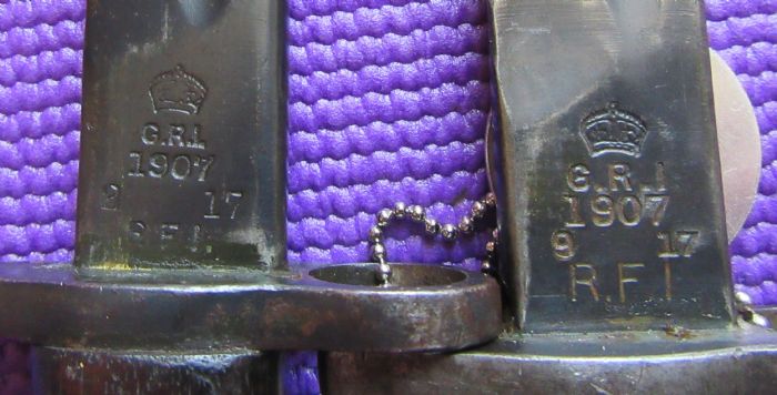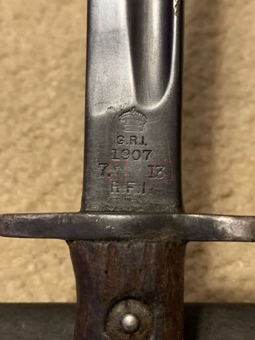 I disagree, I think you still have an original 1913 manufactured bayonet that has only been de-hooked. The faint ghosting marks are the same font suggesting either it was poorly struck the first time or the blade was not removed and the stamp "rested" on the blade prior to its complete removal giving a ghost mark. The 1918 Ishapore P1907 bayonet font is very different. First it is a much heavier stamp, removal would be hard. Second the size of the markings, especially the"RFI" is much larger, this size change occurred in 1917 Third, the Monarch Crown changed from a flat base to a curved base in 1915-16