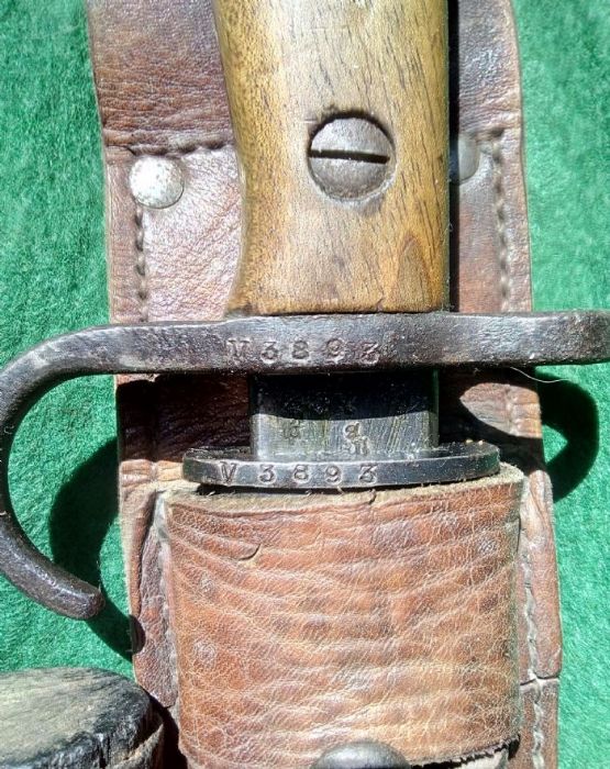...here is the pattern Australian '08/15 leather equivalent to the web equipment combination...the bayonet was made in '11 by Mole with the (pre-November 1913 Military District adoption) State of Victoria Ordnance Department stamps applied to both the crossguard and the scabbard throat - unusual to find a bayonet snd scabbard that have been together after all that amount of time...(8{