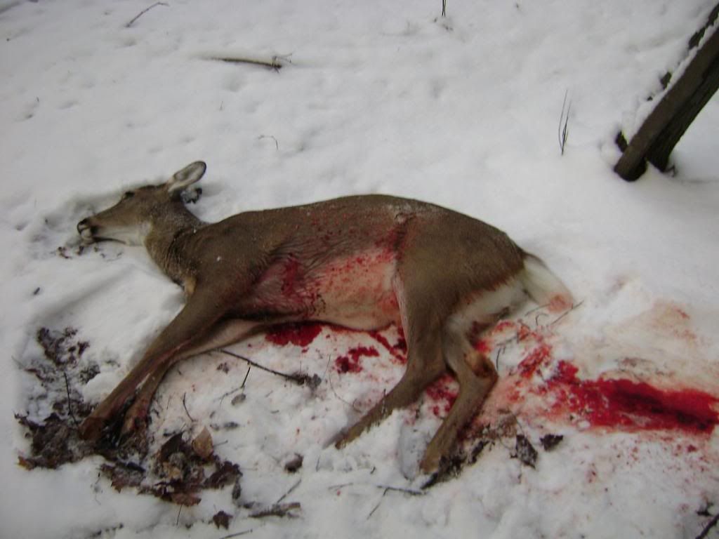 I shot this doe at about 3:00 saturday. A group of about 8-10 does were walking by about 30-35 yards off to the left of my tree stand. I picked out the biggest one and pulled the trigger on the Ol' Ithaca. You have to respect an animal that can run 50-80 yards with a double lung hit! Now roo can stop busting my balls about not getting anything this year.