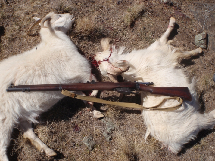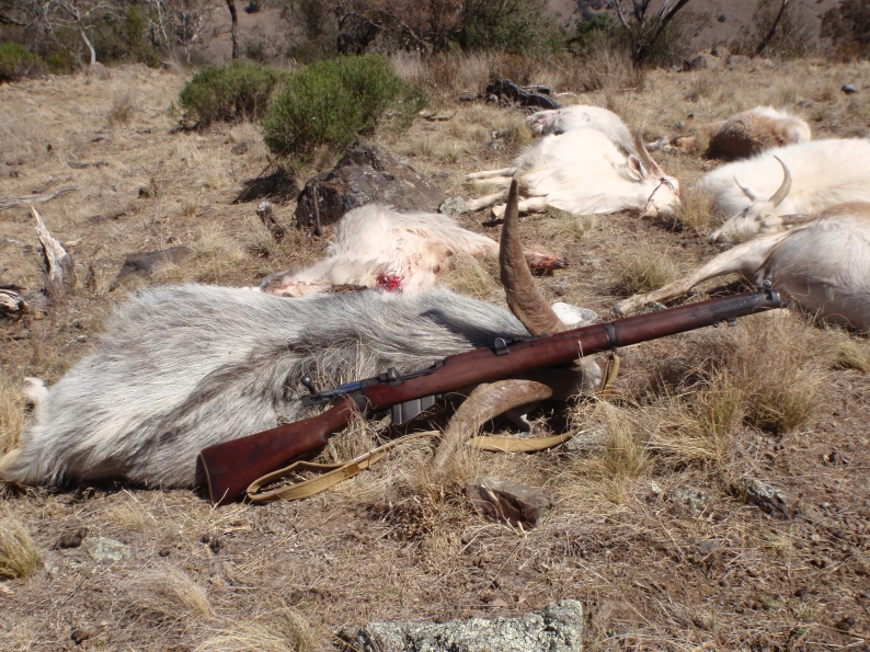 The usual method of hunting involves driving around till we spot a mob and from there we devise a plan of attack, this normally means a flanking manouver and a stalking to 20m before the signal is given to "unleash hell". One hunt in particular comes to mind where 3 of us stalked a mob down onto a spur and crept to 15m before a nanny spied us. The barrage that followed saw 14 goats down and the mob remaining bolting straight down into the gully below. We gathered up the goats for a pic and noticed the goats climbing the hill accross the valley. Now we've got a metallic shilloutte range that goes out to 475m. We figured that the goats were roughly twice that far so I slid my sight to 700m and lined up on a goat accross the valley. My mates were watching for my fall of shot, just low under its belly. I'd already worked the bolt with a quick flick (damn I love the Lee action!) held just a touch higher and WHAM! The 174g pill dropped the goat on the spot my good mate just smiled and said something about me being wasted as an armourer while the other bloke (who hadn't seen me shoot before) was speechless. Yes I love my 303 I love its feel its balance and reliability. Whats more I love proving that this old girl and the cartridge it uses is as good today as when it was introduced over 100 years ago.