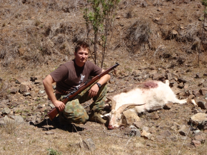 Well there are a few pigs getting around this place but they aren't as common here as the goats. WOW when I first went to this property I was amazed by the sheer numbers. We would see mobs of 5-50 on every second hill we looked at. They seem to frequent the same hills too which makes life easier for us. Now most people use .223 .243 or .308 here NOT us we've used everything from .22 Hornet to 303-25, 7.62x54R, 44-40, 300 H&H, 30-30, 12gauge, .275 Rigby and even .450 Nitro Express and my mates .450 wildcat the .450 ASS (more bang than a 458Win). All these get used on the goats as well my ever faithful omni present Lithgow No1 Mk3 as issued of course!