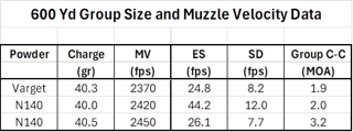 Wx was warm and humid again today, similar to last weeks tests (40.0 and 40.5 gr N140). Getting tired of this, looking forward to fall. Winds were switchy today, so shot these at 300 yds, last weeks were at 600 yds. Again, basic load data is: PPU Case neck sized WLR Primer Vihtavuori N140 Powder, all charges weighed 174 gr Sierra MatchKing 3.07” Cartridge Overall Length These are all 10 shot groups fired off the bench. Garmin XERO Chrono. Group size is center to center extreme spread in minutes of angle. Temp: 85 deg F. ![]() To duplicate Mk VII velocity specification (2440 fps), 40.3 to 40.4 gr N140 with 174 SMK To duplicate my 40.3 gr Varget Match Load, 39.2 to 39.3 gr N140. Velocity spreads today were larger than last weeks loads, this may indicate that spreads tighten up with N140 at the higher velocities. |