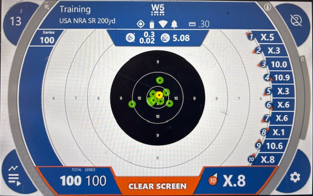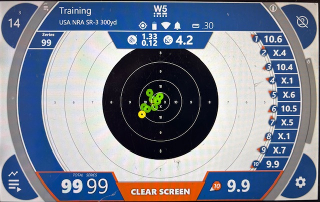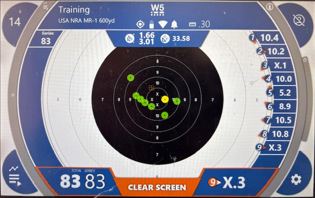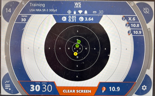 The only remaining issue is to try and reduce the scope parallax error. If I can’t address it with the internal erector cell focus, I will get a plastic lens cap for the eyepiece lens and drill a small central hole thru it. That will force me to keep a consistent eye position. I was able to practically eliminate the left/right parallax error by ensuring the graticule post was centered in the blurred image of the front sight protector, but finding a way to hold a consistent eye position vertically was tough. I only shot 33 rounds today, but even struggling with the parallax, the results were very good! Here is the first 10 shot group at 200 yds. I’m certain shot 3 was due to parallax, I realized at that point the graticule post was not centered within the foresight protector image and my eye position varied from shot to shot. ![]() After some sighting shots, I fired a 3 shot group at 300 yds which measured just 3.6 inches across: ![]() Vertical eye position is very difficult to get consistent, and it shows on this target. Once I can address the parallax issue, I will move out to 600 yards and run the load development ladder test. These tests today were with 40.9 gr Varget, 174 gr Sierra MatchKing (SMK), mean velocity was 2420 fps. |