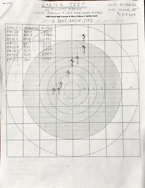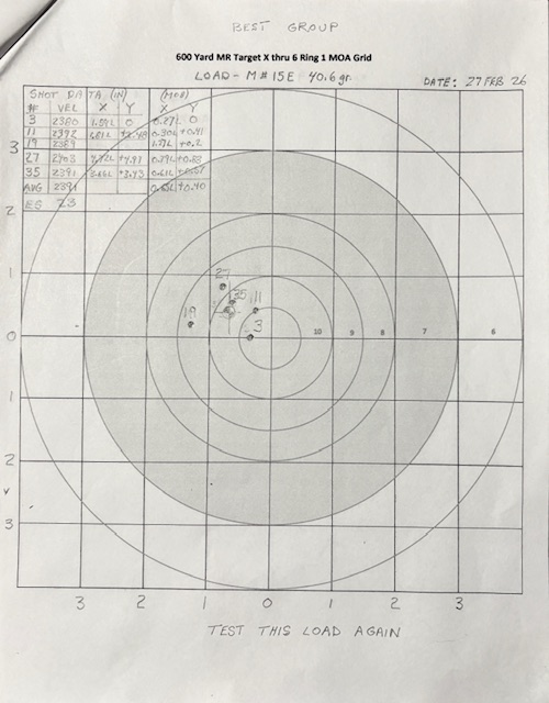 I ran the 40 shot ladder test today at 600 yards with the No. 4 T. Weather conditions were good, 60 - 65 deg F, winds 3 to 5 mph varying direction.