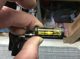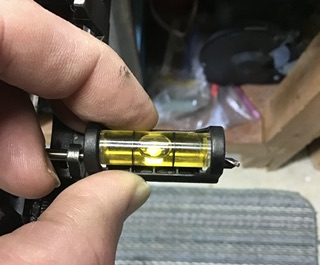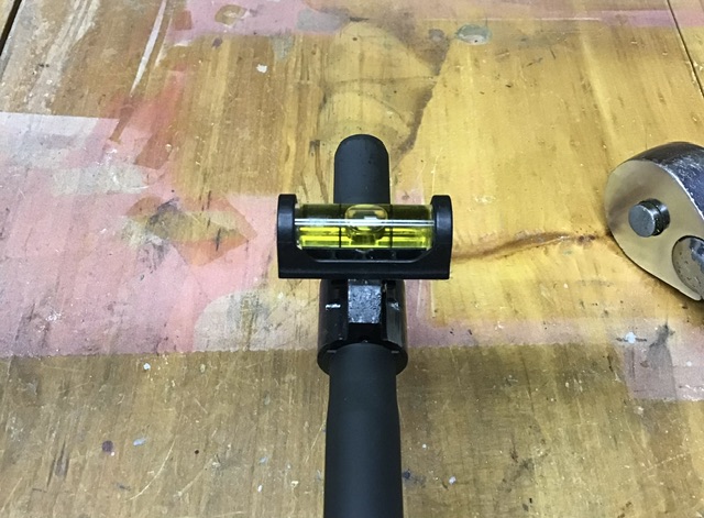 First, get the barrel leveled in the barrel vice. Unfortunately, can’t use the flat on the Knox Form as it is hidden under the vice bushing. I use a spirit level along the top of the front sight block band.