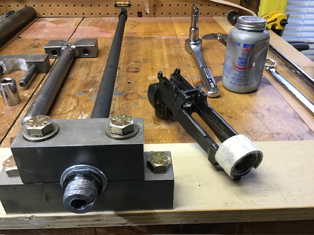 Action wrench and barreled action body removed from the barrel vice. You can see the two aluminum bushings here.