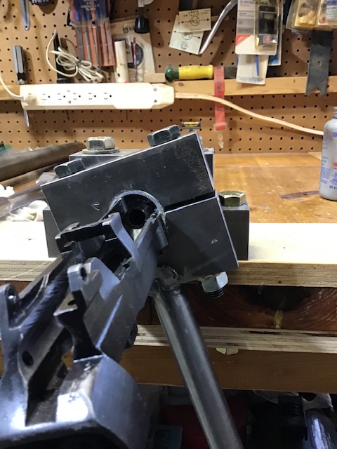 Barrel clamped up very snug, using a 2 foot ratchet and socket on the vice bolts. Powdered rosin on the reinforce and both surfaces of the aluminum bushing and the inside surface of the barrel vice. Anti-seize lubricant on the barrel threads. Action wrench aluminum bushing also dusted with powdered rosin and pushed over front threaded area of the body.