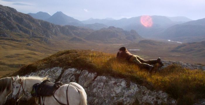 Wow. Rugged country! Love the hunting tweeds! Is the last leading the horse carrying a shotgun?