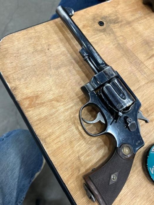 Anyhow stopped at a fellows table looking at some martini cadets and he had a couple pistols at the end of the table and I saw one  -a large frame smith had a lanyard ring with a barrel slightly longer than a US model 1917. Went right to it and it's a smith in 455 with brit proofs , mint bore and cylinders , uncut , no import buggering , and matching. He asked $795 and I asked him how low he'd go. Got it for $750. It's got a fair amount of holster wear . This sure looks like it was carried in the trenches o minimally carried alot while in british use.  Got home and used up the last 12 factory fiocchi 455's I had instead of my better quality reloads. I bought two boxes of Fiocchi 455 a couple years ago and it's some real low quality ammo. Lots of bang , then weak rounds and in 100 rds I got two squibs  one today even that I used a rod to tap it out of the forcing cone. Glad that factory Fiocchi is all used up now - garbage ammo but good brass , although it uses small primers. I did meet and old timer I have to email as he said he had some webley holsters at home he would sell !!!!!!. I hope he is not nose bleed on them.  Well , enjoy the pictures.