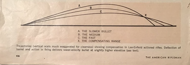 A clue to this appears in page 172 of Reynolds book. Trials carried out at Enfield in 1945 with 26 No. 4 T rifles determined that the scope and mount had the effect to lower the angle of “jump” by 6.5 minutes of angle (on average). On some rifles, the “jump” was found to be as much as negative 2 minutes. Could well be that a slow bullet gives a negative angle of jump and a fast bullet a positive angle of jump.