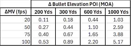 I’ve ran some Strelok bullet trajectory calculations to establish a baseline of expected vertical (elevation) spread on the target as a function of range and muzzle velocity extreme spreads. With this, we can judge if a given rifle shows signs of positive compensation or not.