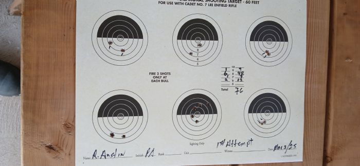 No one seems to have submitted to this, I will. I have a bunch of Army 20 yrd targets,(I`ll shot at 25yrds) 2 shots/target and one sighter target, will that do? As I don`t currently have a working printer. Plus to be fair to you know who, I`ll shoot this seated unsupported with my eyes closed. ![]() ![]() These are 20yrd indoor Armory range targets, and will be a bit smaller looking at 25yrds