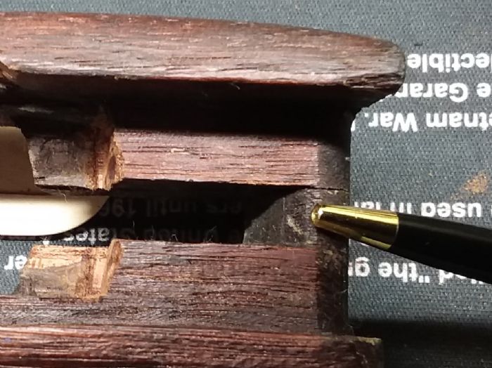 A couple of questions: I did complete the fore stock fitting, shaving off both the draws and around the chamber. It fits now and is tight enough that it takes a couple of soft hits to get it off.I screwed up trying to fit it at about 98% done. It was too tight at the very bottom of the draws. It now has a small separation behind the draws (just above the pen in the picture). Is this repairable? It is seems to be an area that can be glued easily. I have been disassembling the rifle action as I will send it off for refinishing. I have taken the backlight mechanism off so I can clean out all of the black paint. Question. The leaf spring is not coming off after the removal of the screw. I suspect it is glued to the housing with paint as I have not seen any reference to it be secured other than by the screw. Is that correct? I have a replacement leaf spring if taking this one off requires force. They are going to have to drill the trigger pin out as it is not coming out even with a pin pusher. I have a replacement on hand.