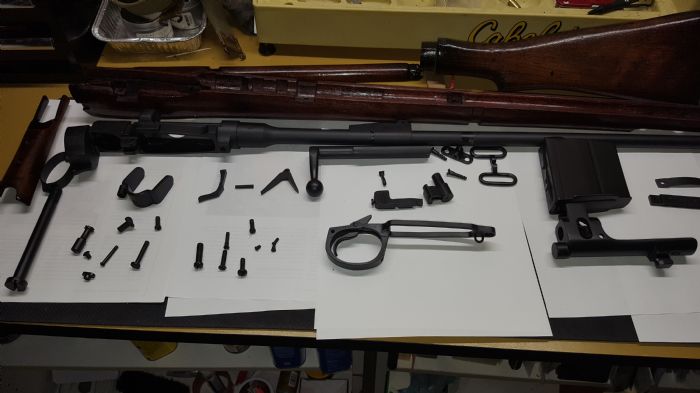 Things have been busy and it took a while to completely disassemble the 2A. After getting it apart except for the trigger (both sides of the pin were peened) I took it to have it Cerekoted. Not quite authentic but it is black paint and I can actually work some of the parts like the sights. Also now one can see the SN and all of the stampings. Most will eventually be under wood but I should not have to worry about corrosion in unseen places. Now I have to pull out all of my pictures and make sure I get all of the screws lined up.