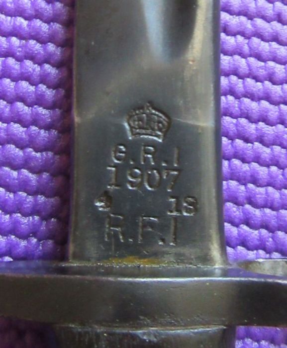 I disagree, I think you still have an original 1913 manufactured bayonet that has only been de-hooked. The faint ghosting marks are the same font suggesting either it was poorly struck the first time or the blade was not removed and the stamp "rested" on the blade prior to its complete removal giving a ghost mark. The 1918 Ishapore P1907 bayonet font is very different. First it is a much heavier stamp, removal would be hard. Second the size of the markings, especially the"RFI" is much larger, this size change occurred in 1917 Third, the Monarch Crown changed from a flat base to a curved base in 1915-16