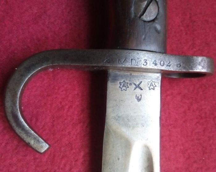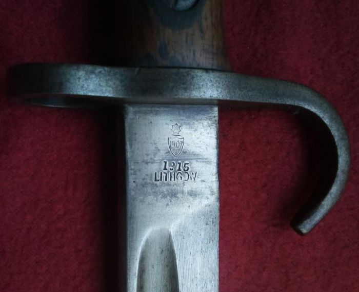 ...here is my example - among the last of the hooked-quillion examples...made at SAF Lithgow, they started production in 1913 with about 1k rifles/bayonets in that year, about 10k in 1914 and about 15k in 1915...as the hook to the quillion ceased being applied sometime between August/October of that year, there were only somewhere between 11k and 20k bayonets with the hook ever made at Lithgow...the blade on my example has a bright finish all the way from the quillion to the (very) sharp point...does anybody know if there was a variation in the amount of blueing applied to the bayonet blades...(8{