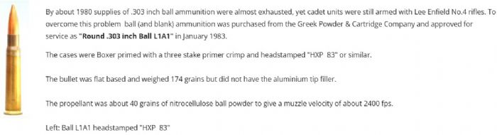 One question I have asked repeatedly but never received an answer on is what year did the British government initiate a contract with HXP to purchase ammunition, given that English language labeled boxes pre-date the official adoption of the HXP produced L1A1 ball round for cadets in 1983. I suspect they did but I cannot find any evidence to support this. From Tony's site: ![]() Source: https://sites.google.com/site/britmilammo/-303-inch/-303-inch-cordite-ball-mark-vi-to-viiiz I have HXP .303 British rounds from 1969 through 1989, including a grenade launching blank dated 1984.