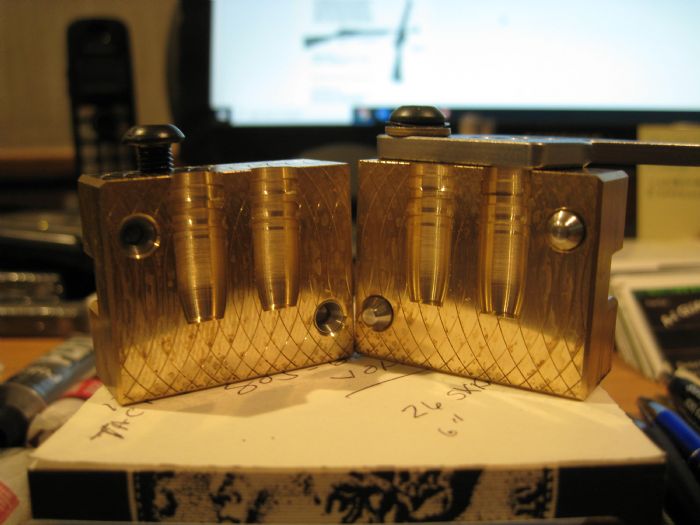 It is a 250 gr Bore Rider style Boolit which should feed well from the magazine as the nose section is about twice as long as the Lee 358-200 boolit. As you can see the mold is Machined Brass Jewelry! I will cast a bunch of these up this weekend and get them sized and loaded up. Will be starting at 26 gr of 5744 and working up until the velocity is between 1700-1800 fps which should be the sweet spot for this type of Boolit. We'll See Randy