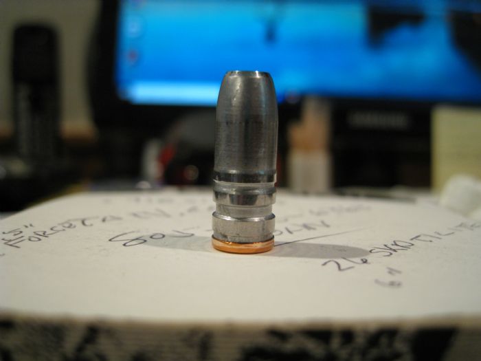 It took the mold about 30 pours to start producing good Boolits. After everything got heated up and running right it made this one. I ran it thru the sizing die and installed the Gas Check. The driving bands were only about .0005-.001 above the .360 sizing die so not much happened to them.