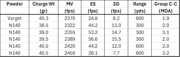 I neglected to give the weather conditions. It was not all that hot, 85 deg F at the time of shooting the N140 loads. N140 is supposed to be quite temperature stable. Vihtavuori website gives the following for N140 with 174 SMK seated to 3.070”: Min 38.4 gr at 2379 fps Max 41.7 gr at 2566 fps Based on my tests, I suspect that is about right. I’m rather suspect of the claim that 41.8 gr duplicates Mk 7 ball muzzle velocities. Or, Vihtavuori has changed their powder formulation since then. I’m thinking it’s more like 39.8 gr. |