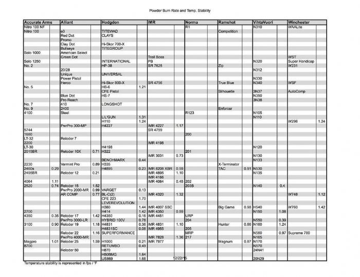 Geoff, I've had this temperature stability chart saved on my hard drive which shows the expected velocity gain per degree rise in temperature. Unfortunately the baseline isn't shown nor the low and high temps that the chart can be expected to be reliable but it is useful as a tool to know which powders are the least affected by heat. I have no idea who developed this chart nor can I speak to its accuracy. ![]() |