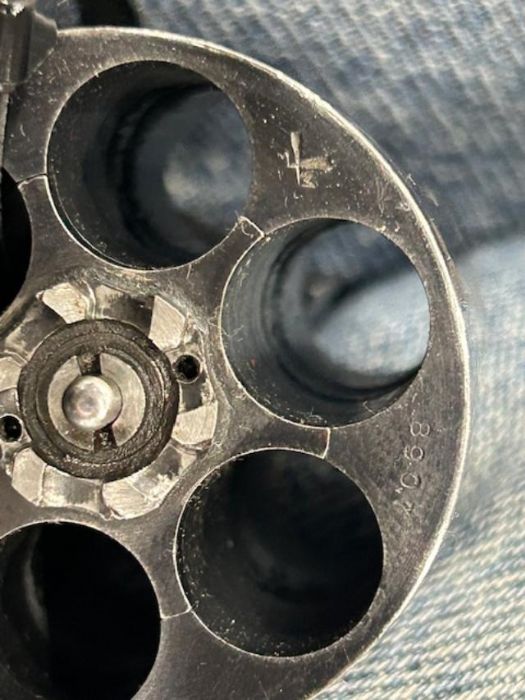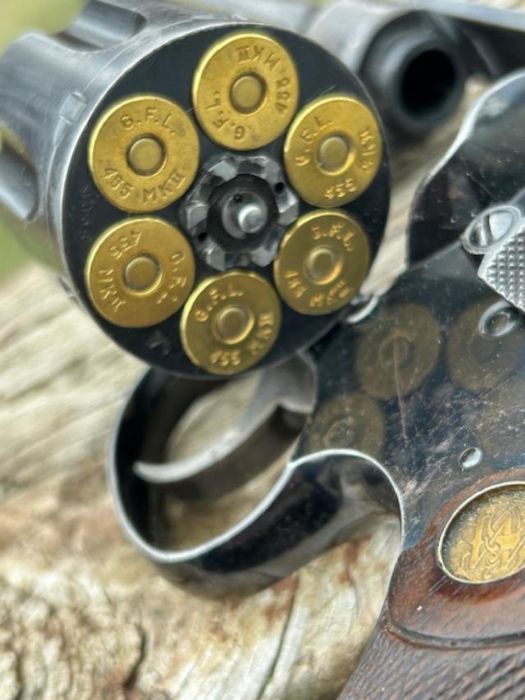 Anyhow stopped at a fellows table looking at some martini cadets and he had a couple pistols at the end of the table and I saw one  -a large frame smith had a lanyard ring with a barrel slightly longer than a US model 1917. Went right to it and it's a smith in 455 with brit proofs , mint bore and cylinders , uncut , no import buggering , and matching. He asked $795 and I asked him how low he'd go. Got it for $750. It's got a fair amount of holster wear . This sure looks like it was carried in the trenches o minimally carried alot while in british use.  Got home and used up the last 12 factory fiocchi 455's I had instead of my better quality reloads. I bought two boxes of Fiocchi 455 a couple years ago and it's some real low quality ammo. Lots of bang , then weak rounds and in 100 rds I got two squibs  one today even that I used a rod to tap it out of the forcing cone. Glad that factory Fiocchi is all used up now - garbage ammo but good brass , although it uses small primers. I did meet and old timer I have to email as he said he had some webley holsters at home he would sell !!!!!!. I hope he is not nose bleed on them.  Well , enjoy the pictures.