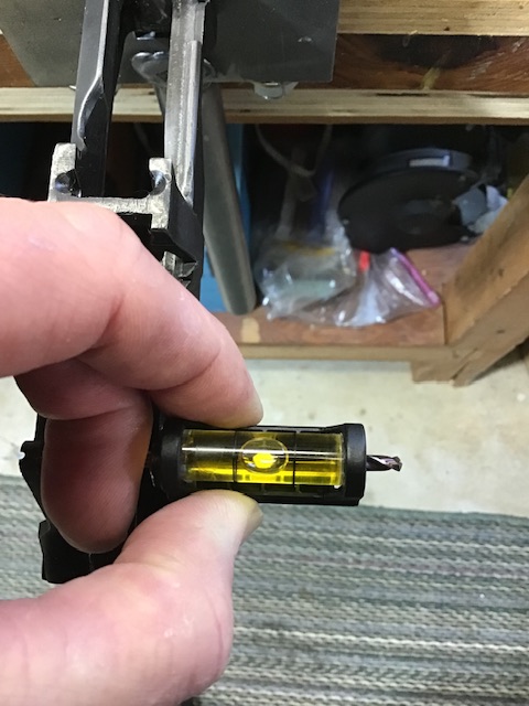 First, get the barrel leveled in the barrel vice. Unfortunately, can’t use the flat on the Knox Form as it is hidden under the vice bushing. I use a spirit level along the top of the front sight block band.