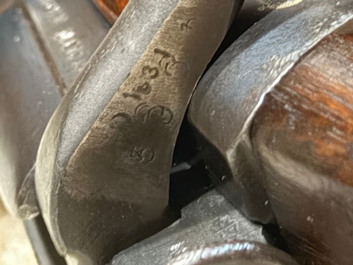Here is an overview of the rifle Appears to be a 1916 BSA SMLE MK3* ![]() Some strange things that ive noticed. Almost everything has matching SN including Receiver Barrel Sight Nose cap bolt has matching SN but seems to have been restamped The brass coin in the stock has the SN stamped Please see photos ![]() ![]() ![]() ![]() Another odd thing is being a MK3* it doesnt have the mag cut off and volley sights but for some reason this rifle has the old MK3 rear sight with windage adjustment. ![]() Any info anyone can provide would be greatly appriciated Thanks.